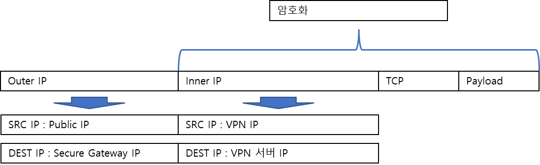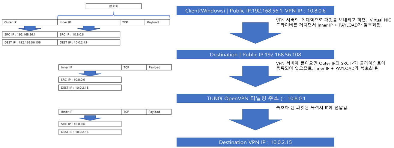 - 패킷이 VPN 대역의 IP로 연결을 할 시에는 Virtual NIC Driver를 거치면서 Inner IP가 생성되고, 암호화된다.
