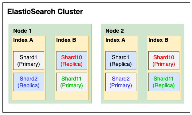 Primary 샤드, Replicas 샤드는 동일한 데이터는 담고 있으며, 반드시 서로 다른 노드에 저장된다.