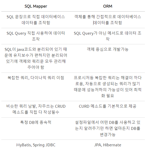 우리 회사에서 사용하는 MyBatis의 경우 SQL Mapper에 해당하고 jpa는 ORM이라고 흔히 부른다.