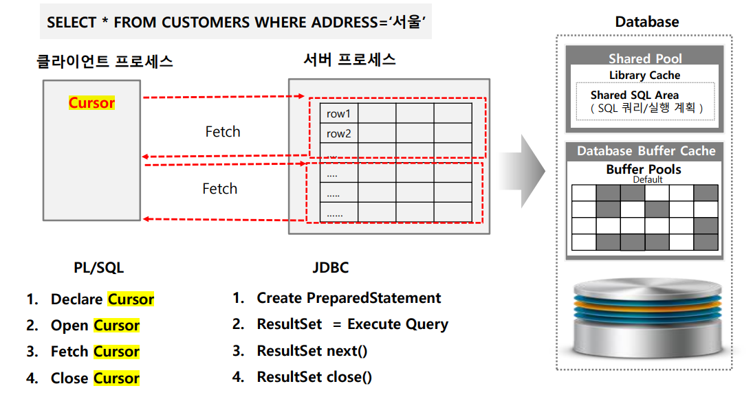 1. 클라이언트는 cursor을 통해 서버의 프로세스에게 데이터 CRUD를 요청