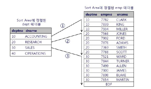 NL 조인과 소트 머지 조인의 방식은 거의 똑같다고 볼 수 있다. 차이점은 Sort Area에 미리 정렬해 둔 자료구조를 이용한다는 점만 다를 뿐 조인 프로세싱 자체는 NL조인과 같다. 그러면 성능 차이는 어디서 나는지 궁금할 수 있다.