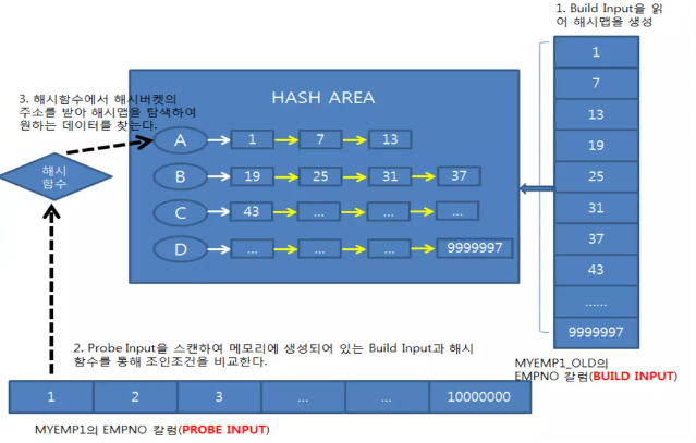 조건에 해당하는 데이터를 읽어 조인 컬럼을 해시 함수에 넣고, 해시 체인을 스캔하면서 조인을 수행한다.